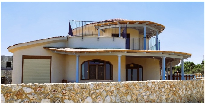 I make the roofs in private houses with straighter lines for practical reasons and take advantage of the meeting between the round walls and the straight lines of the roof to enrich the house in terms of form.